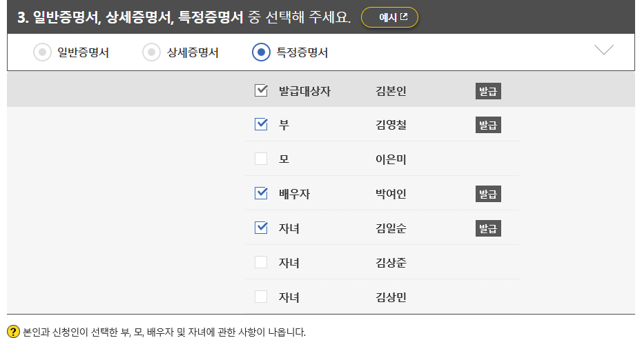 ③ 일반증명서, 상세증명서, 특정증명서 중 선택