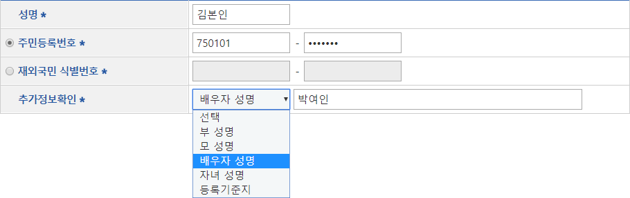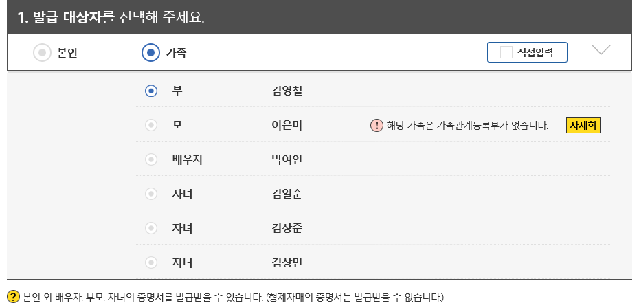 가족인 경우, 자동으로 현출된 가족 목록 중 발급받고자 하는 발급 대상자를 선택합니다.