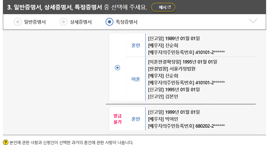 3) 혼인관계증명서 선택 후 특정증명서 선택 시 전혼관계에 대한 목록이 현출되며 증명하고자하는 전혼관계를 선택합니다. (현재 유효한 혼인관계는 선택 불가)