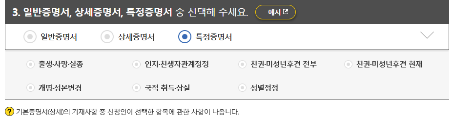 2) 기본증명서 선택 후 특정증명서 선택 시 7개의 선택항목이 나타나며 신청인이 필요한 항목을 선택합니다.