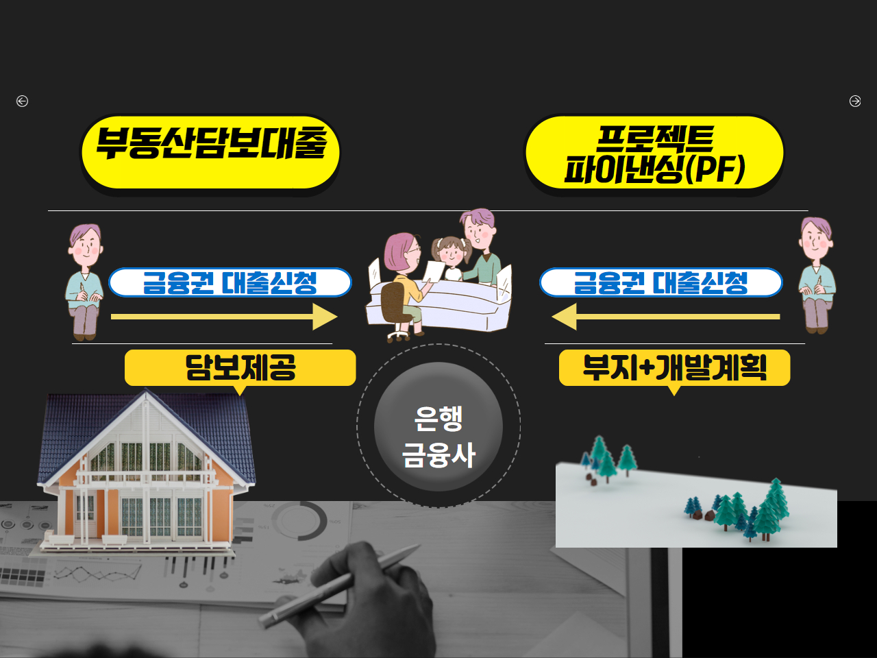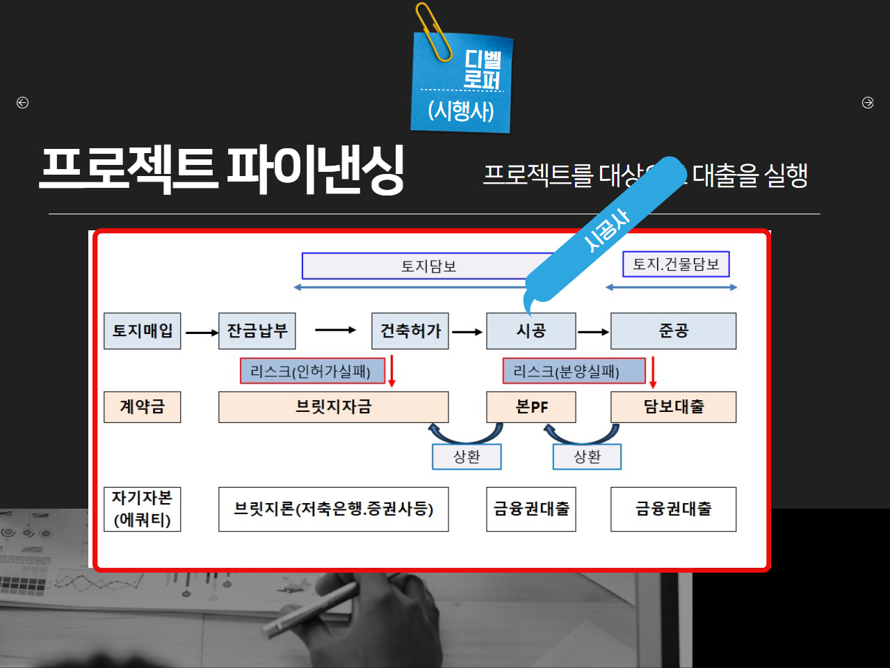 그 프로젝트를 담보로 금융차입을 실행하는 것을 '프로젝트 파이낸싱(PF)'이라고 합니다.