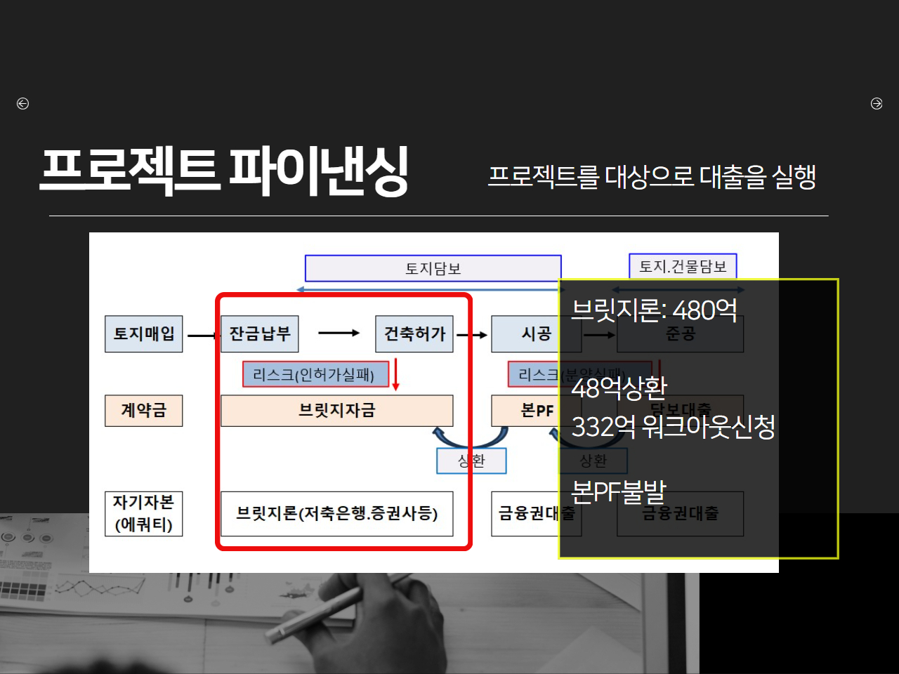 해당 사업을 담보로 480억을 브릿지론으로 대출을 받았습니다.