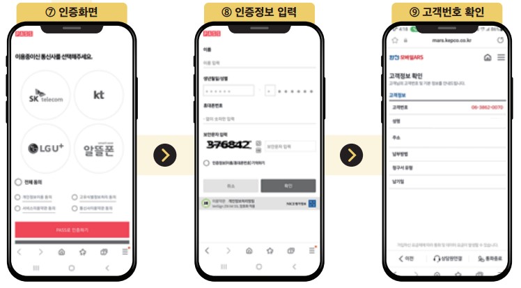 ⑦ 본인인증 → ⑧ 인증정보 입력 → ⑨ 고객번호 확인