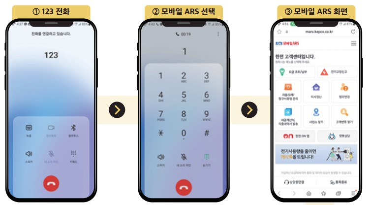 ① 123 전화 → ② 모바일 ARS 선택 → ③ 모바일 ARS 화면 →