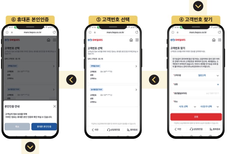 ④ 고객번호 찾기 화면→ ⑤ 고객번호 선택 → ⑥ 본인인증 선택→