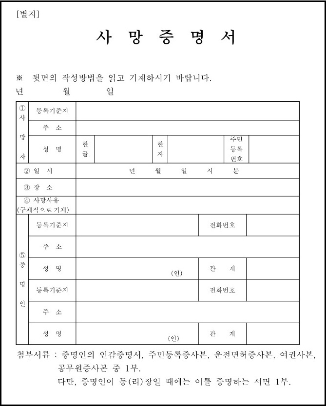 사망신고서에는 사망의 사실을 증명하기 위하여 사망자의 진단서나 검안서를 첨부하여야 합니다. 진단서는 사망시에 사망자를 진찰한 의사가 작성한 것이고, 검안서는 사망 후에 사체를 검안한 의사가 작성한 사망사실을 증명하는 내용의 문서입니다.