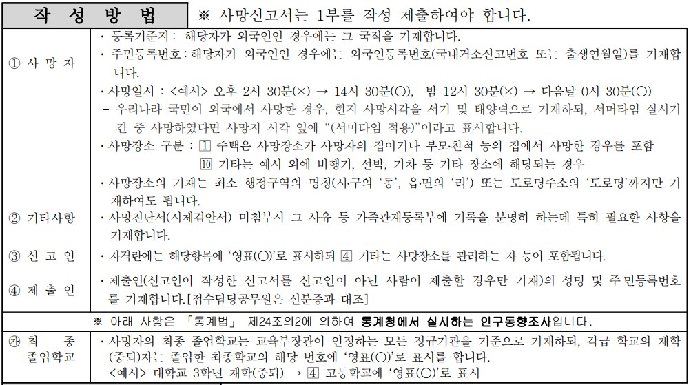 사망의 연월일과 시각을 기재하되, 사망시각은 24시각제를 기준으로 하여 사망시각이 오후 10인 때에는 22시로, 오후 12시인 때에는 익일 0시로 기재합니다.