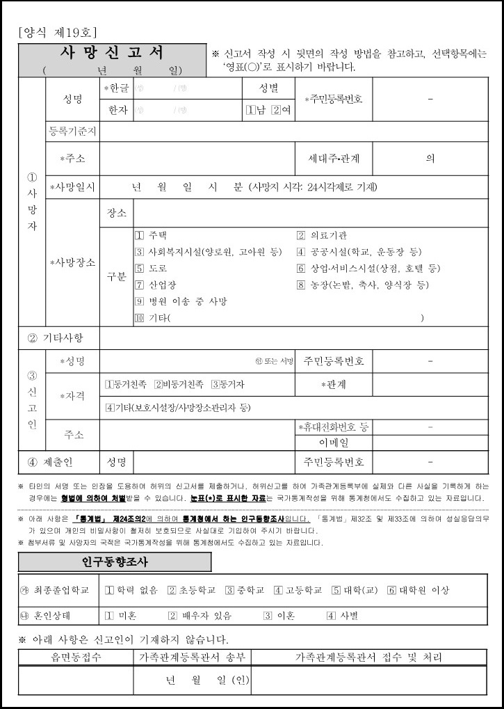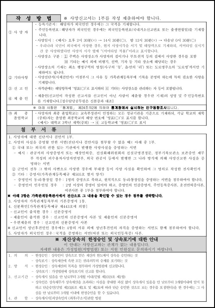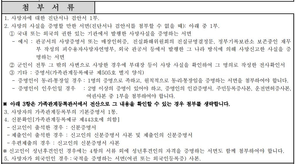 재외국민의 사망신고를 거주지법에 따라 일본 당국에 신고하여 처리된 사망수리증명서 등이 있는 때에는 사망신고서에 그 증명서만을 첨부하여 사망신고를 할 수 있습니다.
